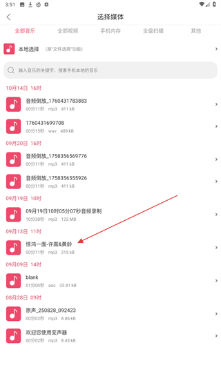 3、从手机本地文件夹中选择需提取乐器声音的音频文件,支持MP3、WAV、AAC等常见格式。