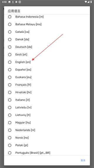 4、在弹出的语言选择页面内,点击English的按钮即可切换。
