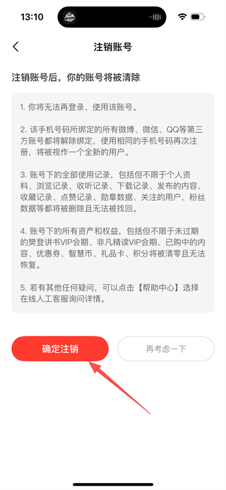 5、在注销账号页面,确认注销说明后点击确定注销按钮,完成账号注销操作。
