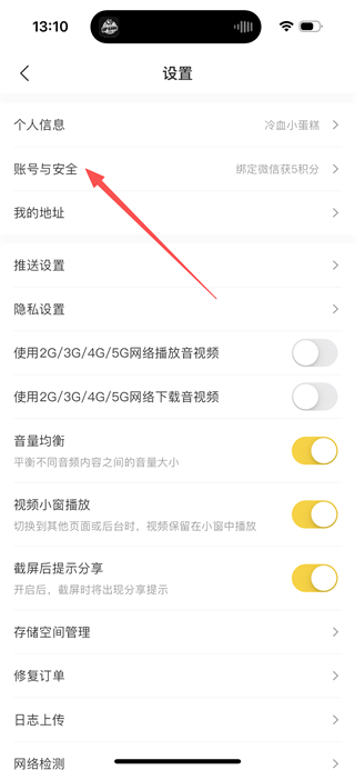 3、在设置页面,点击账号与安全选项,进入账号与安全页面。