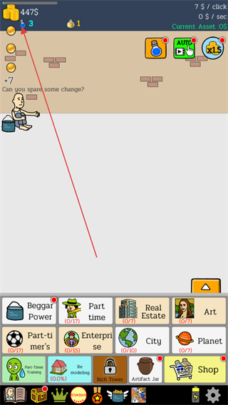 1、点击BeggarPower按钮,进入乞丐能力界面,提升乞丐等级获取更多收益。