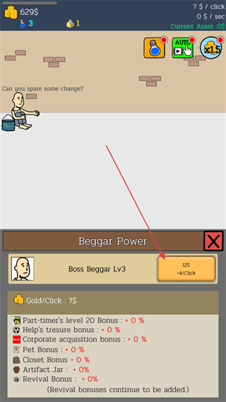 2、在乞丐能力界面,点击升级按钮提升BossBeggar等级,增加每次点击的金币收益。