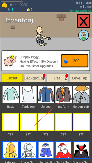 3、进入Inventory界面,选择服装如uniform更换,获得属性加成。