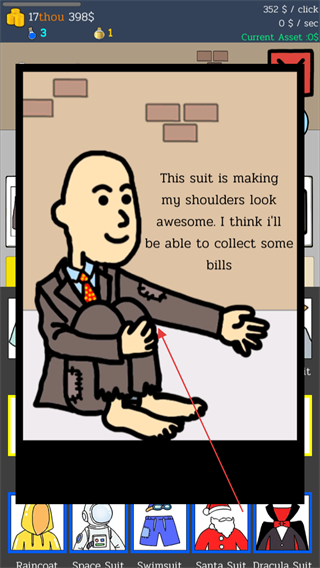 4、更换服装后,乞丐外观变化,同时提升收益效率,继续积累金币推进游戏。