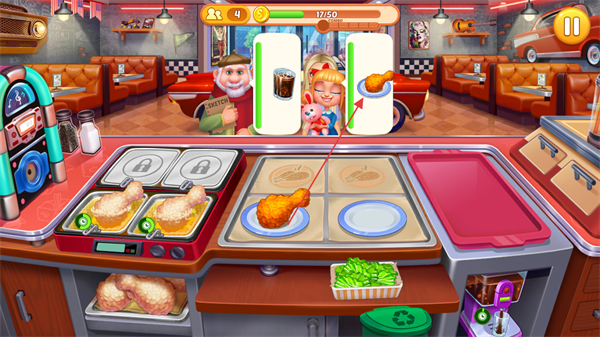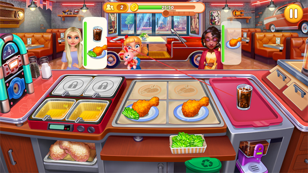 采用鲜明的美式卡通设计,色彩鲜艳明快,餐厅场景细节丰富,食物造型逼真且富有食欲,整体画风精致靓丽,带来愉悦的视觉体验。