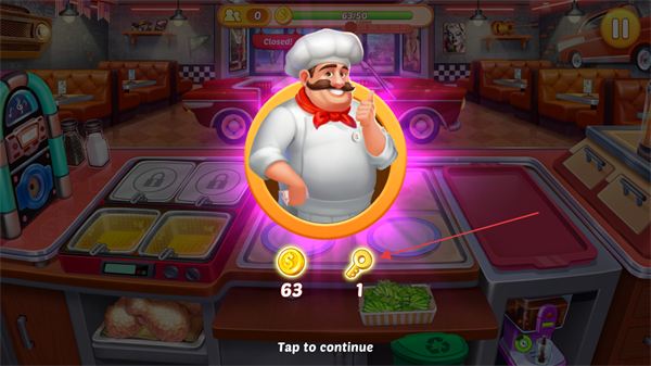 4、完成关卡后获得金币和钥匙奖励,点击Taptocontinue继续游戏。