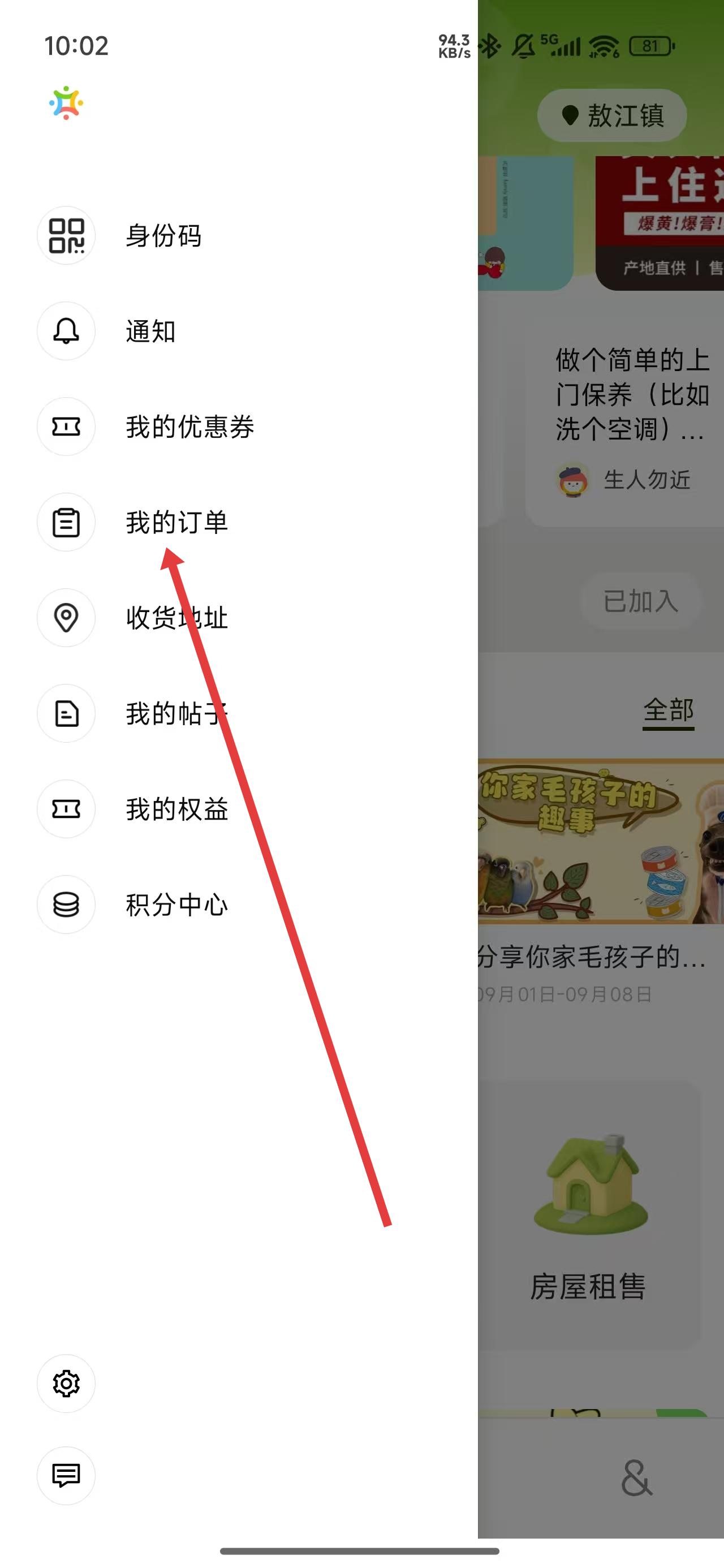 2、在侧边栏展开后,可以点击我的订单选项进入查看订单信息。