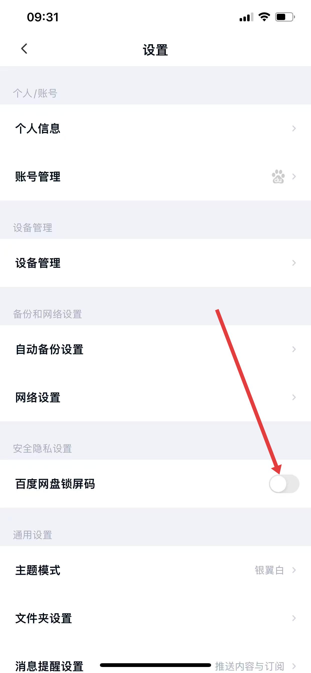 2、在个人界面中,找到并点击设置选项,找到百度网盘锁屏码,点击其右侧的开关按钮将其开启。