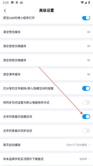 4、找到文件列表展示隐藏空间选项,点击开关按钮将其关闭。