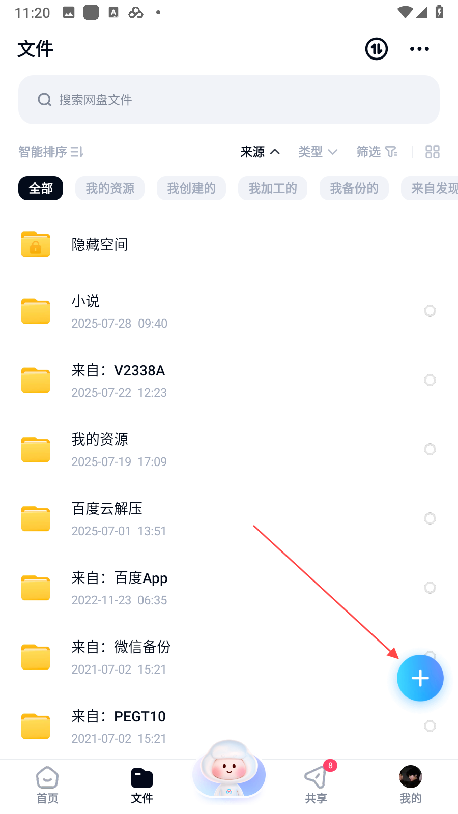 1、打开百度网盘应用,点击底部导航栏中的文件选项,进入文件管理界面,在该界面中可以看到已有的文件夹、文件等资源,然后看到右下方有一个蓝色加号。