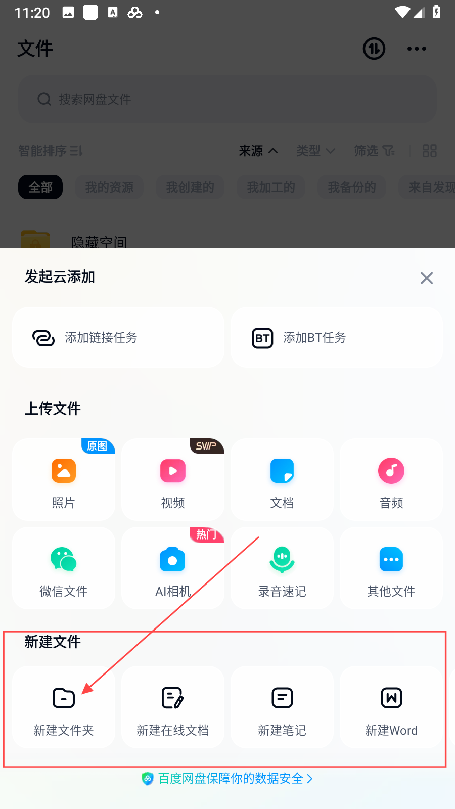 2、点击右下角蓝色带+号的圆形按钮,会弹出一个操作菜单,在菜单中找到新建文件板块,点击其中的新建文件夹选项。