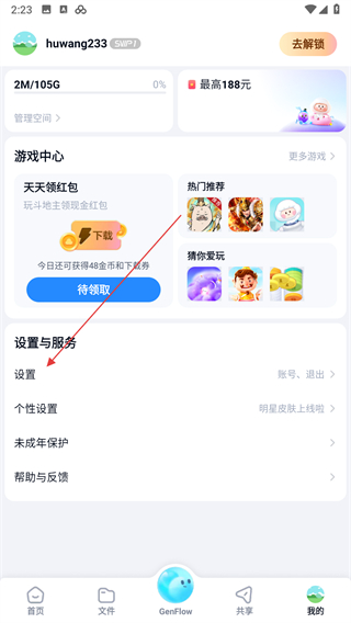 2、在个人中心页面的设置与服务区域,找到设置选项并点击,进入设置。