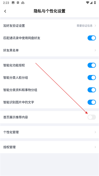 4、找到首页展示推荐内容选项,点击右侧的开关按钮将其开启即可。
