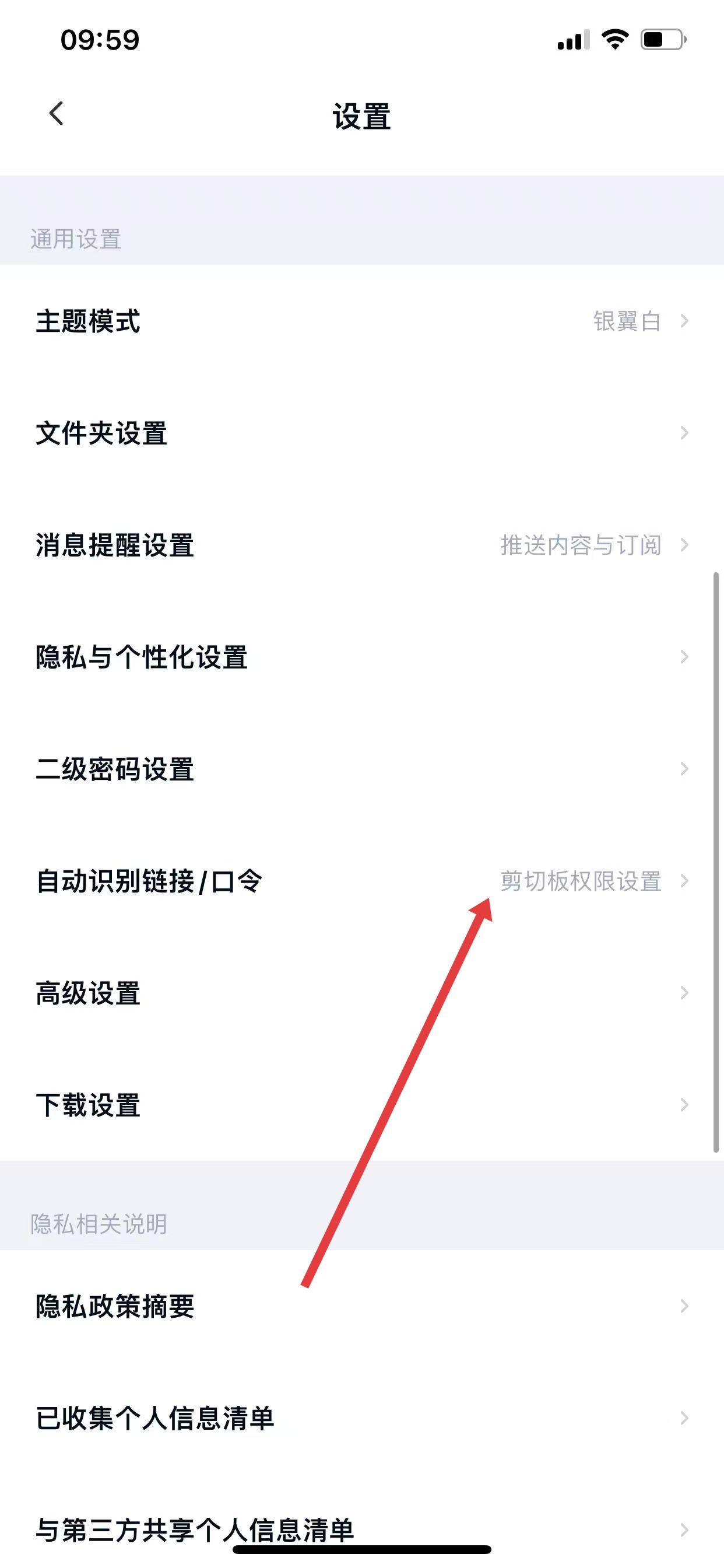 2、找到自动识别链接/口令或剪切板权限设置选项并点击进入。