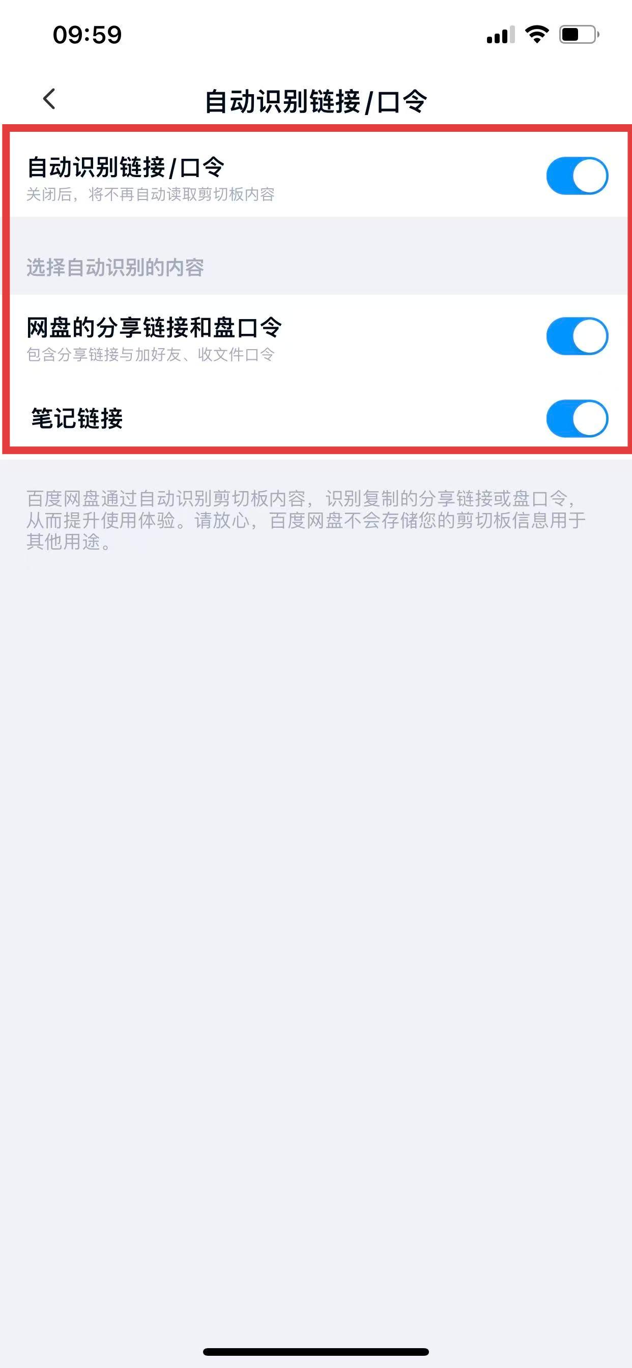 3、打开自动识别链接/口令开关,确保网盘的分享链接和盘口令、笔记链接等相关开关也处于打开状态。