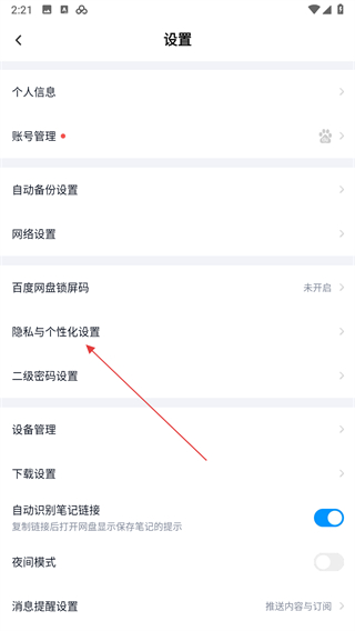 1、打开百度网盘App,进入我的,点击设置选项,进入设置界面。