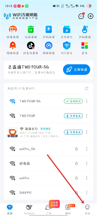 1、打开WiFi万能钥匙进入主界面,点击右下角我的选项,进入个人中心界面。