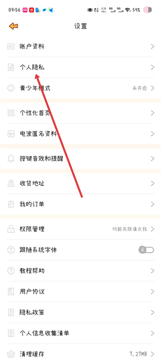 3、向下滑动选项列表,找到个人隐私选项并点击。