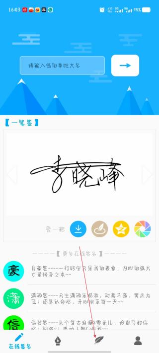 1、打开艺术签名定制类应用,点击界面下方的订制签名选项,进入展示多款签名样式的页面。
