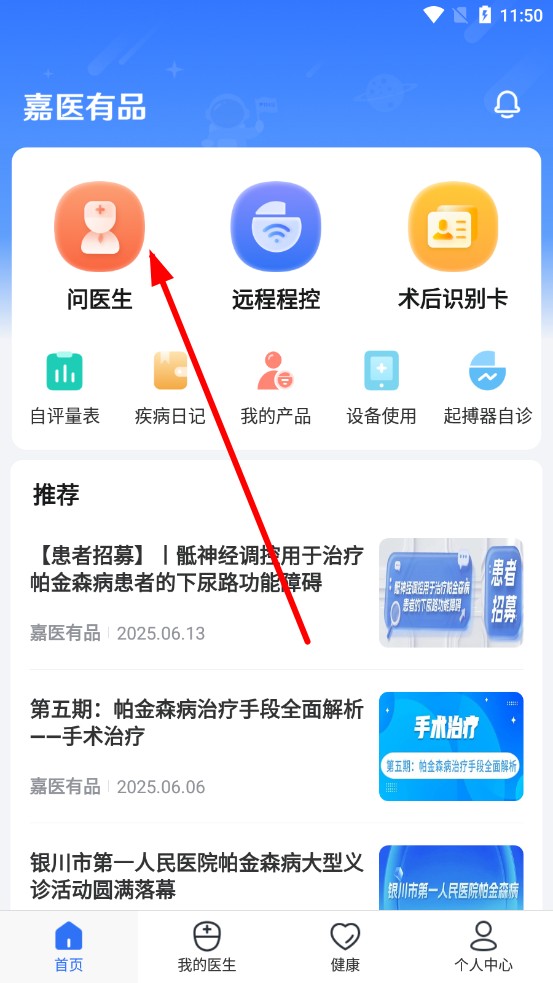 1、若有医疗咨询需求,打开嘉医有品APP首页,点击顶部左侧区域、橙色底色搭配医护人形图标的问医生功能入口即可咨询。