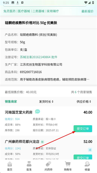 2、进入药品详情页面,选择销售商家后点击提交订单。
