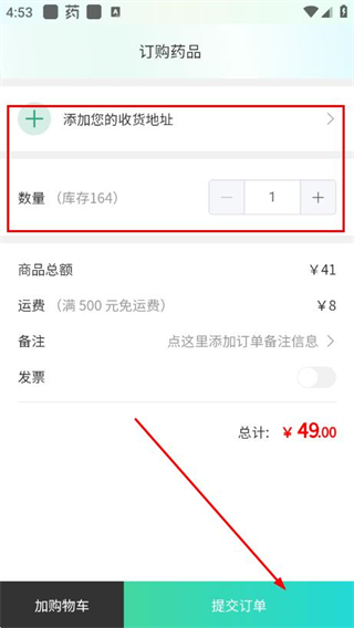 3、在订购药品页面,添加收货地址、选择购买数量后,点击提交订单。