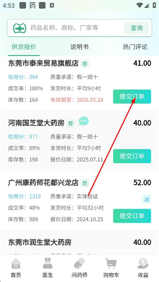2、在供货报价页面选择目标商家,点击对应的提交订单,进入订购药品页面。