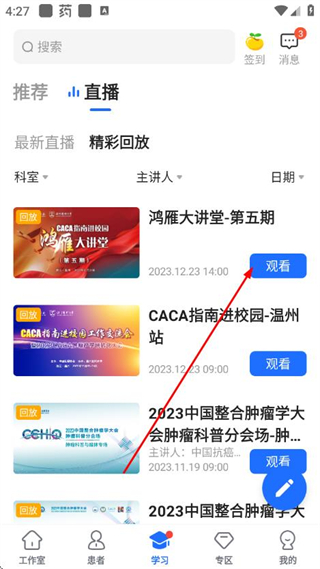 1、在妙手医生医生版app的“学习”页面,点击精彩直播右侧的查看更多。