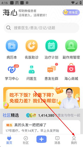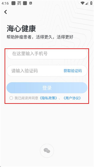 1、在海心抗癌app的用户隐私政策弹窗中,点击同意,进入首页。