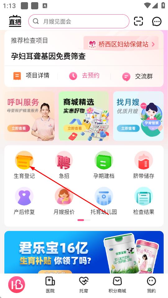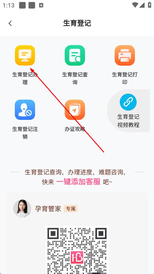 1、打开孕健康APP,在首页找到生育登记图标,点击进入。