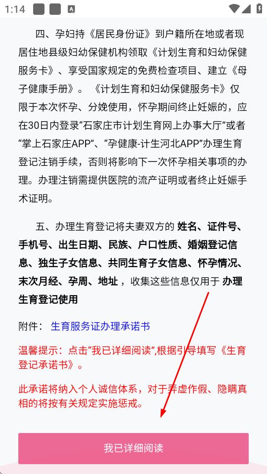 4、仔细阅读办理生育登记的相关说明及要求,点击我已详细阅读按钮。