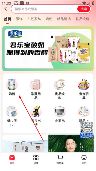 2、在商城页面点击奶粉分类选项,进入奶粉商品列表页面。