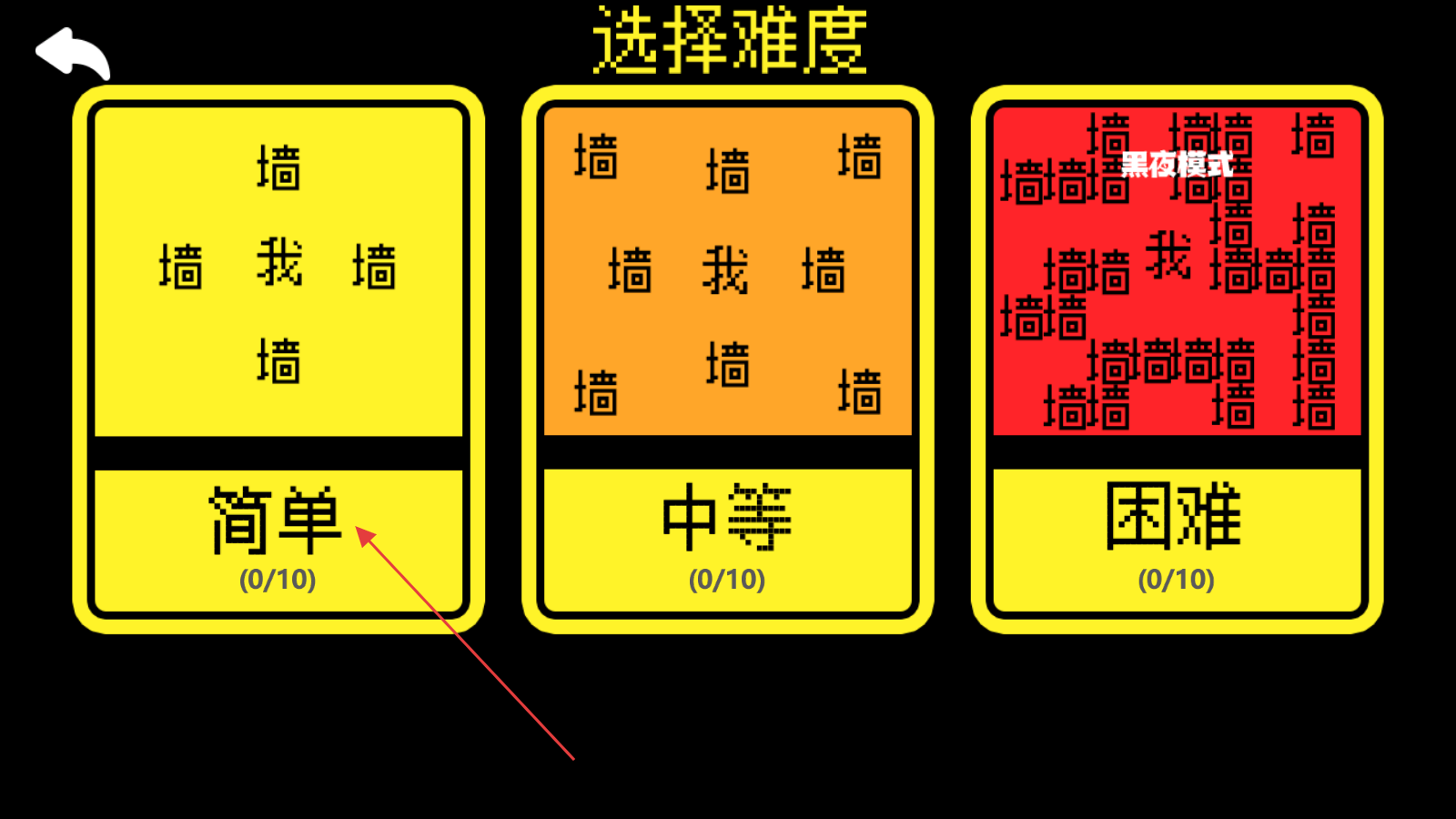 1、设有简单、中等、困难三个难度档位,不同难度对应不同复杂度的迷宫布局,困难模式还带有黑夜视觉效果。