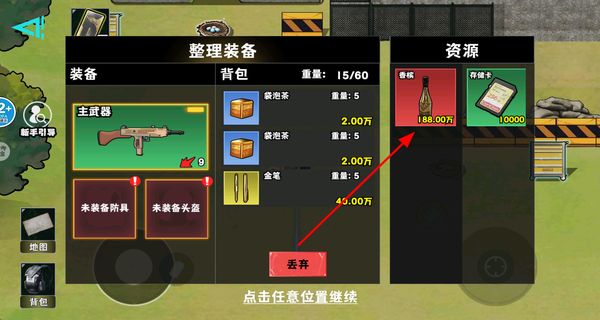 3、进入背包界面整理装备,查看获取的资源道具,合理管理背包重量,为后续的战场行动做准备。
