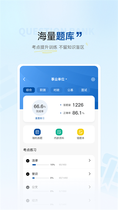 根据目标考试的考点、难度,智能出题,通过记录用户练习情况,生成数据评估报告,预测考分。