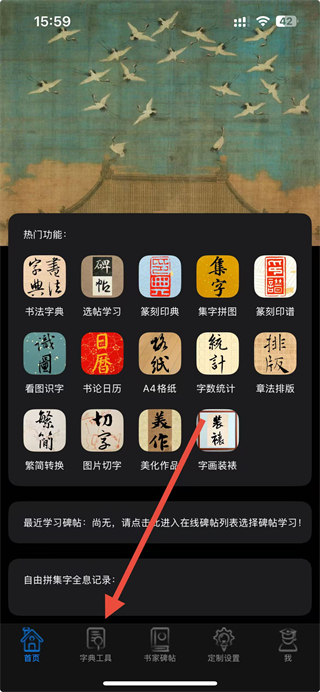 1、在不厌书法首页底部导航栏,找到字典工具选项,点击进入页面。
