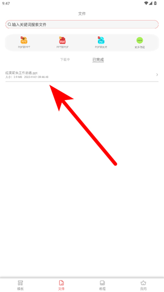 3、下载完成后,在文件页面找到红黄箭头工作总结.ppt文件。