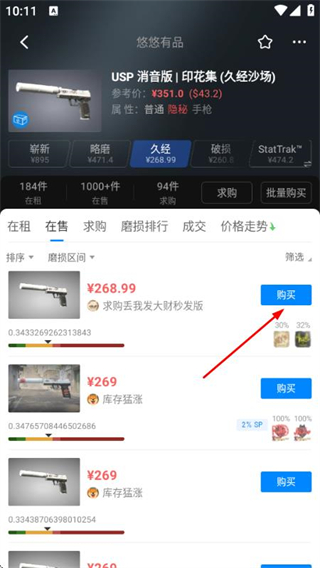 3、在饰品详情页面找到对应商品后,点击对应的购买按钮,进行该饰品的购买操作。