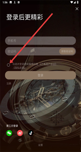 3、在勾选好同意按钮后,点击上方输入框填写手机号,以便获取验证码进行登录。