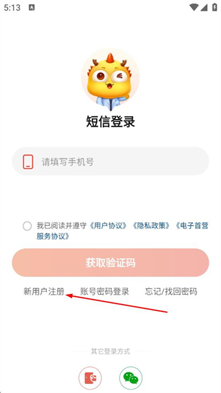 1、在短信登录页面,点击新用户注册选项,进入注册页面。