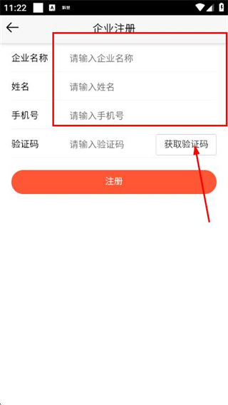 2、在企业注册页面填写企业名称、姓名、手机号后,点击获取验证码按钮。
