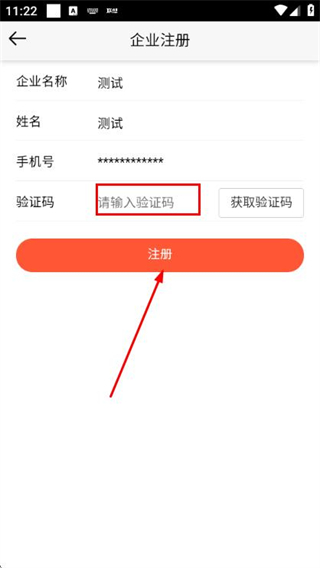 3、在验证码输入框填写收到的验证码后,点击注册按钮,完成企业注册操作。