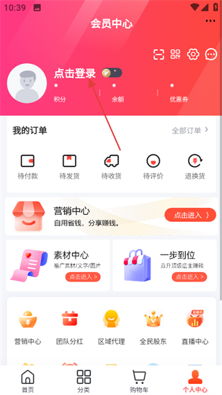 2、在会员中心页面,点击点击登录区域,进入登录页面。