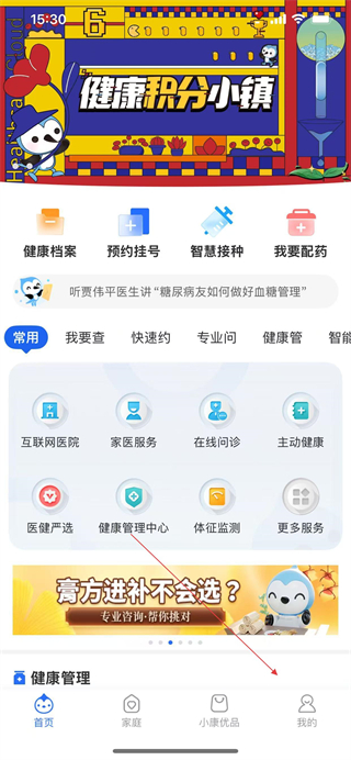 1、在健康云的首页,点击底部我的选项,进入个人中心页面