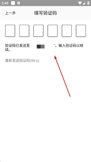 3、在填写验证码页面输入收到的验证码,完成账号注册。