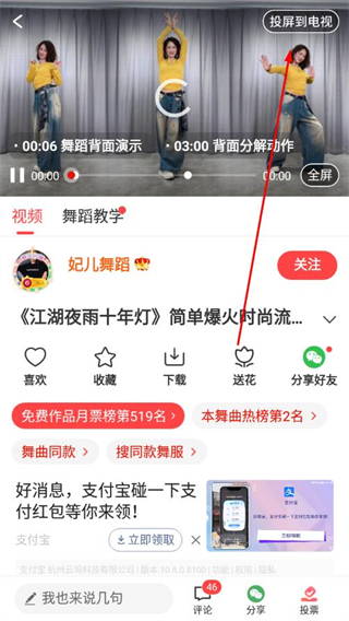 2、在视频播放页面,点击右上角投屏到电视选项,进入投电视页面。