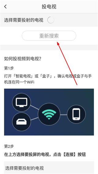 3、在投电视页面点击搜索,待搜索到电视设备后,完成投屏连接。