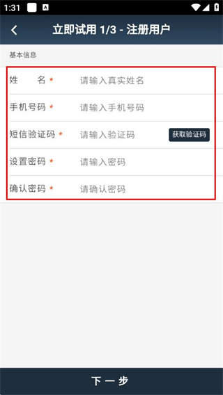 3、填写姓名、手机号码、短信验证码、设置并确认密码后,点击下一步完成注册。