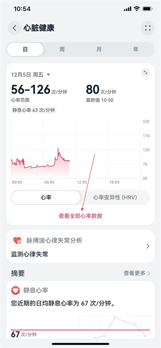 2、在心脏健康详情页中,点击查看全部心率数据选项,进入心率数据页面。