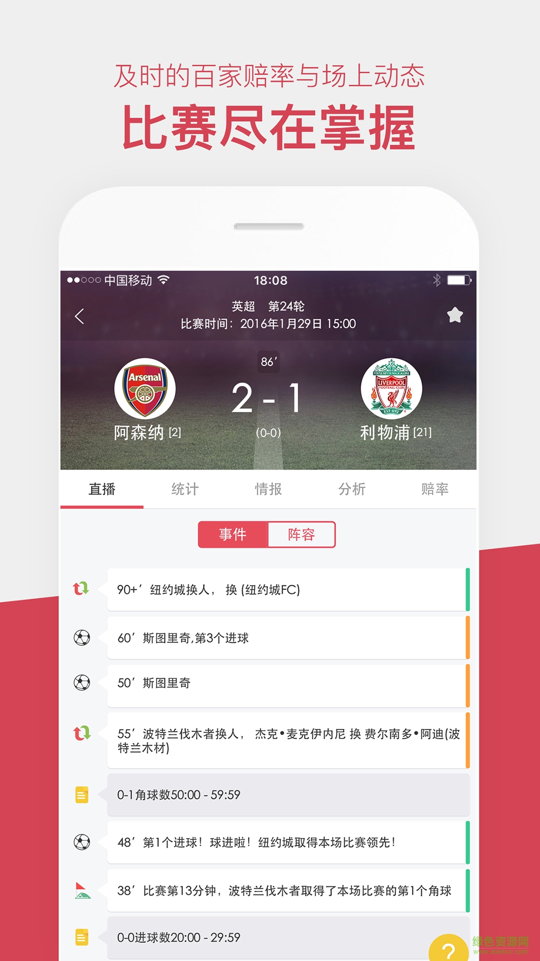 【动画直播】准确即时还原赛场战况的动画直播、快速精准的战报集锦,会在比分改写后及时告诉你所钟爱球队和关注比赛的比分,让你不错过每一场精彩比赛